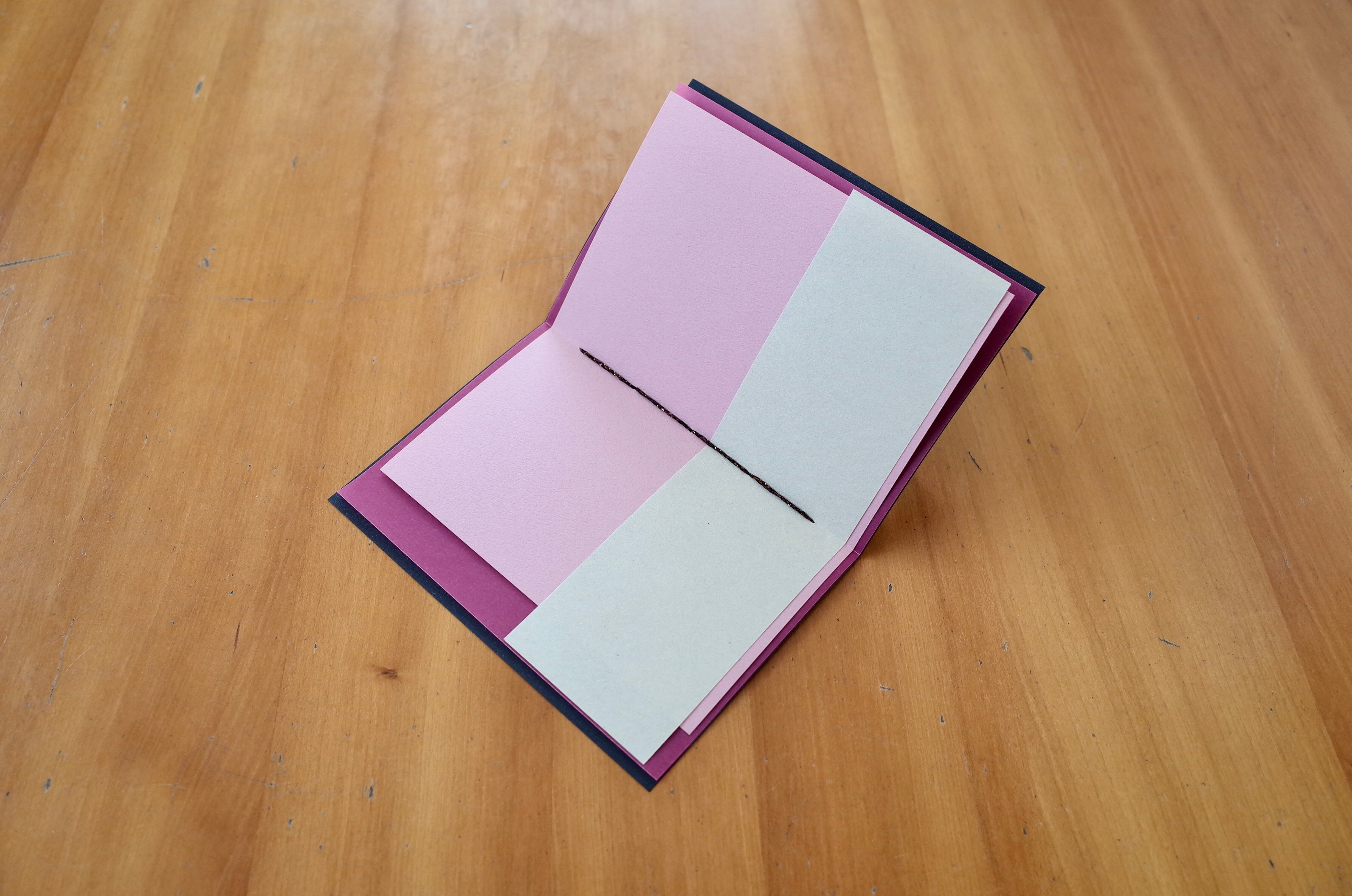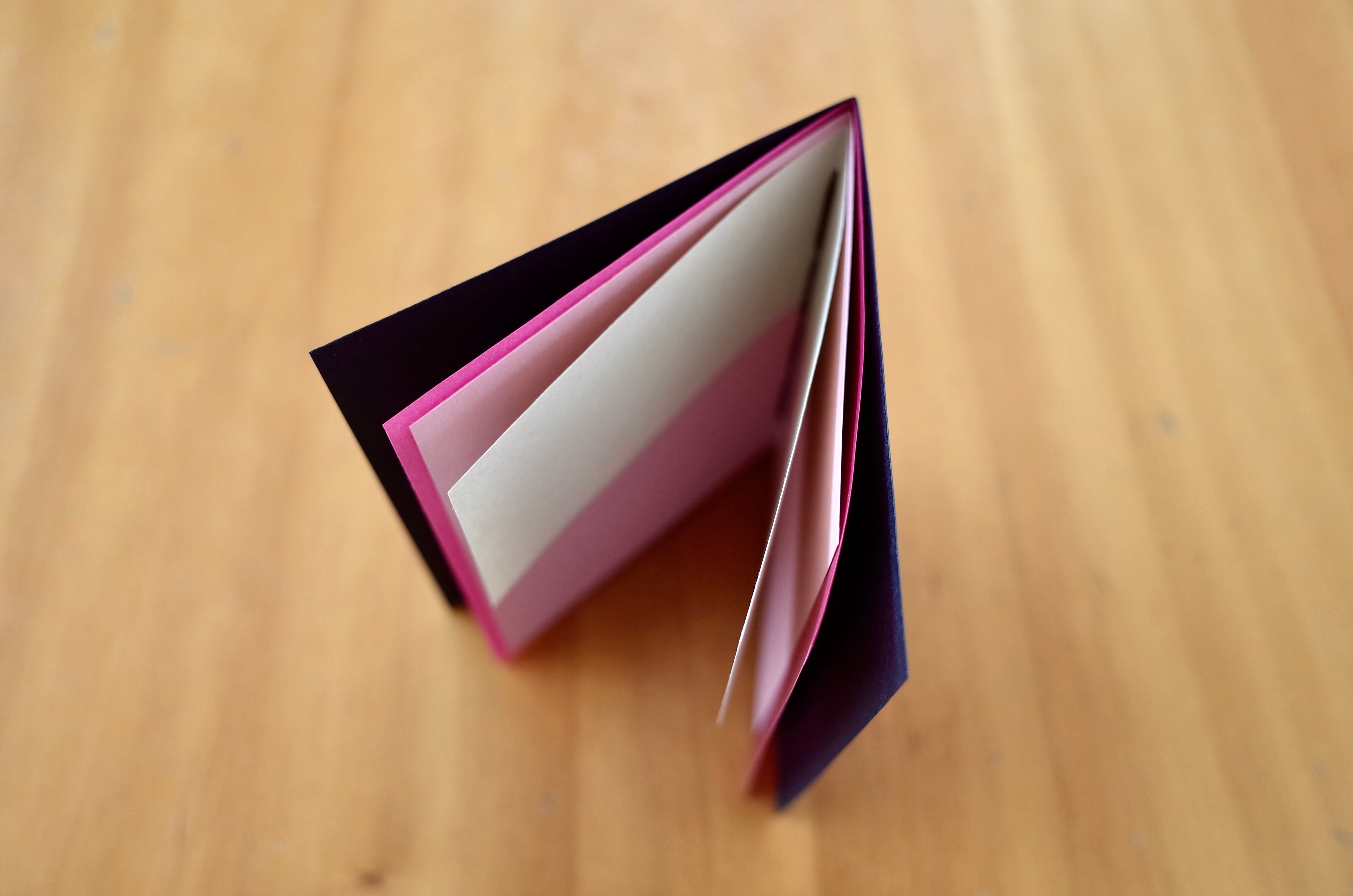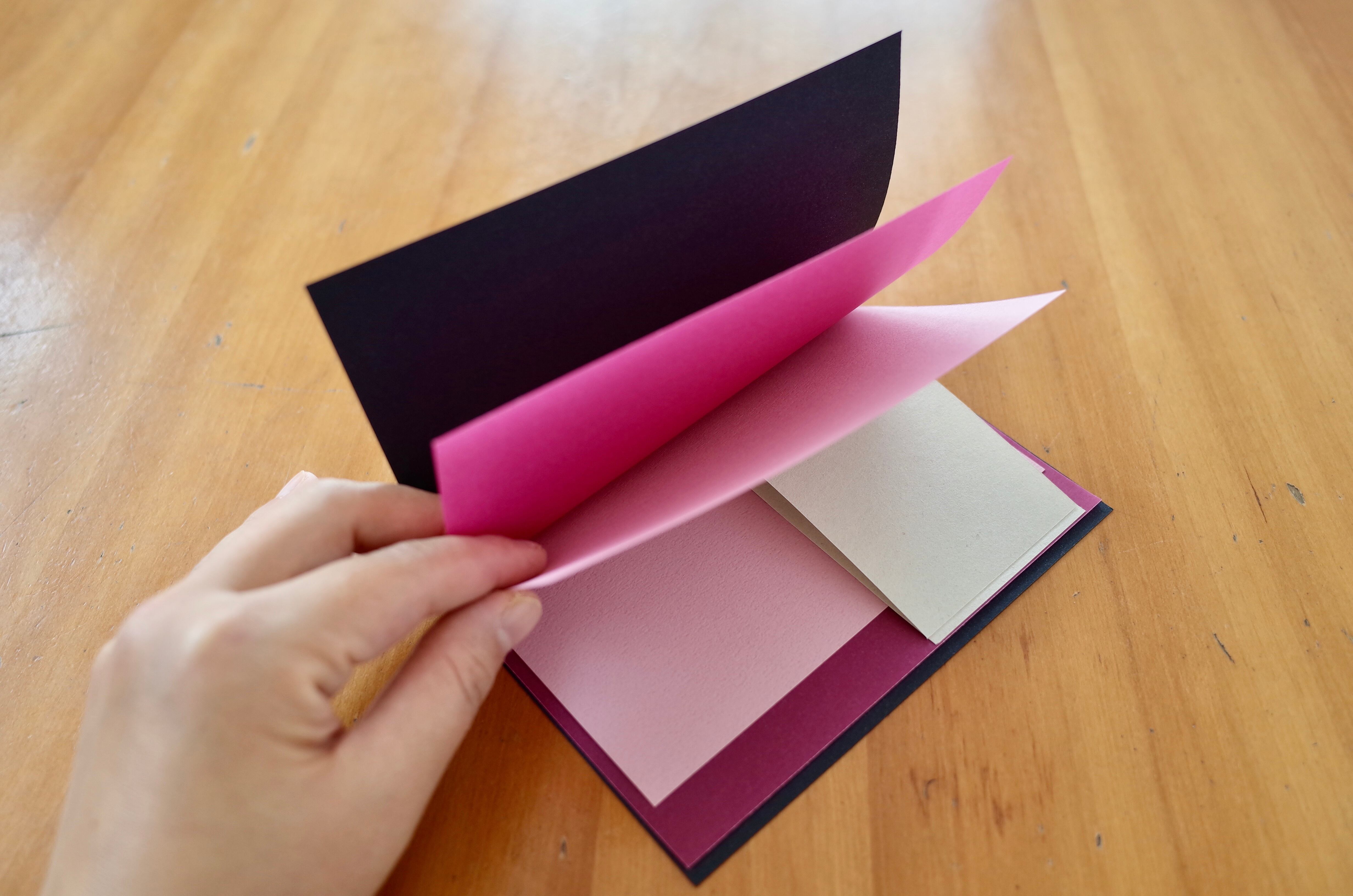 ピンクの紙は、はがきサイズの3/4くらいの大きさです。